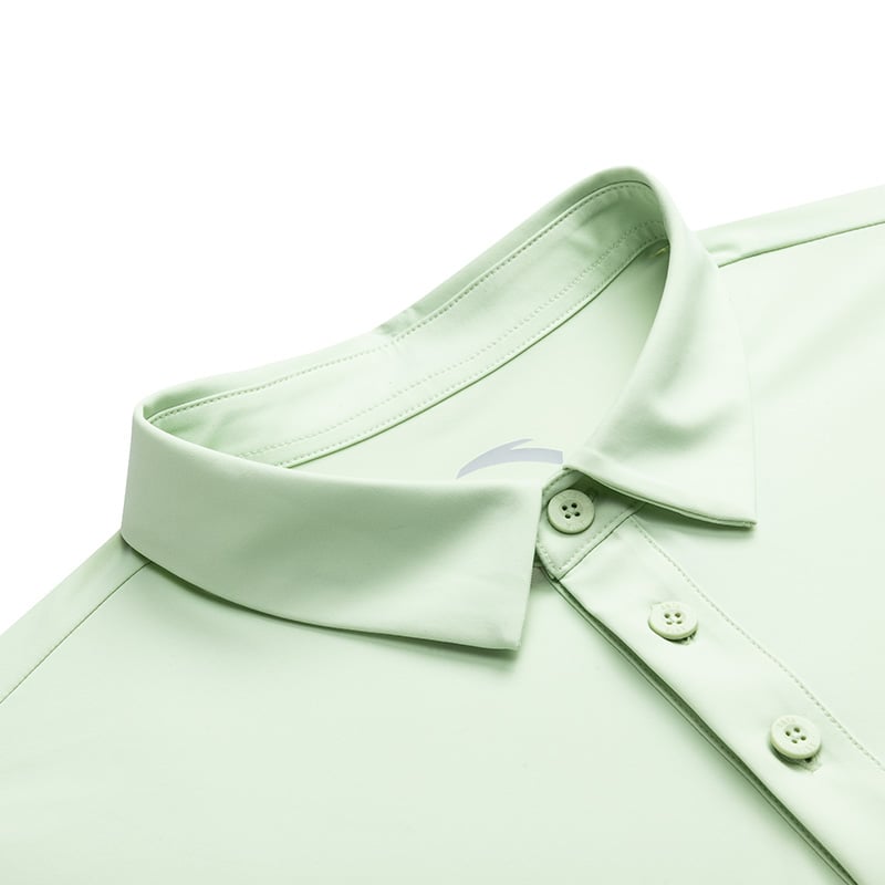 Cổ bẻ polo cổ điển kết hợp hàng cúc gọn gàng.