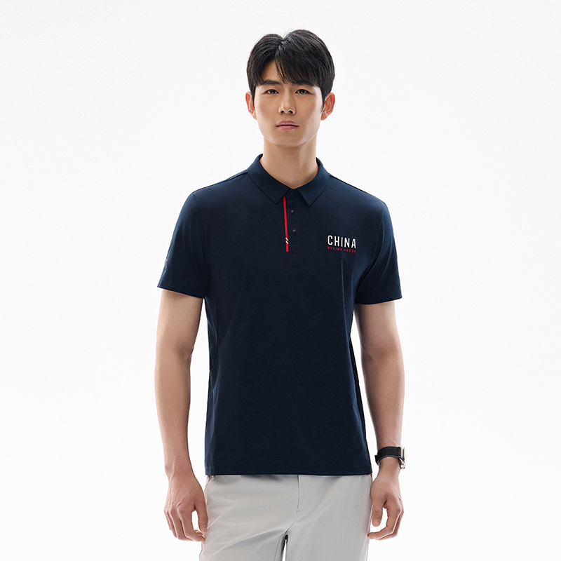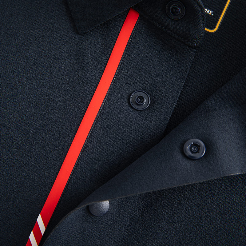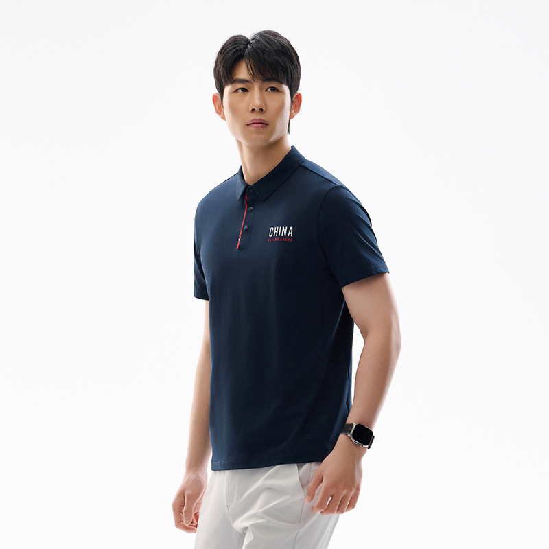 Cổ bẻ polo cổ điển kết hợp hàng cúc gọn gàng.