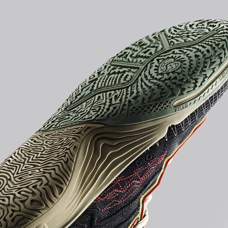 Gót giày: Phần gót giày nổi bật với mảng thêu họa tiết biểu tượng cá nhân của Kyrie Irving. Cấu trúc gót dày dặn, bo tròn, kết hợp đệm êm giúp tăng độ ổn định và hỗ trợ tốt khi tiếp đất, phù hợp với các chuyển động nhanh và đổi hướng liên tục trong bóng rổ.