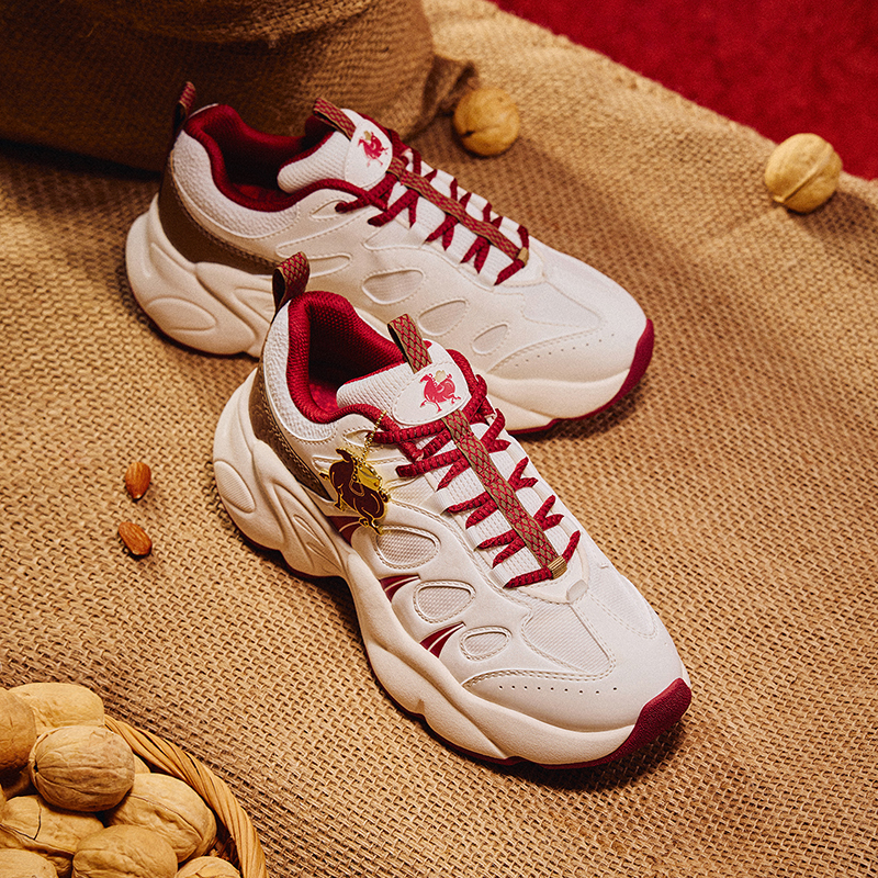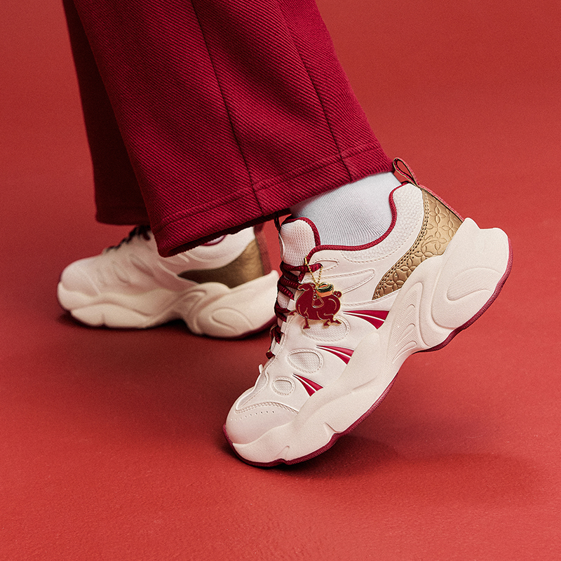 Giày sử dụng tông trắng kem chủ đạo kết hợp đỏ may mắn, tạo cảm giác trẻ trung, dễ phối đồ và phù hợp cho những dịp đặc biệt như đi chơi Tết, du xuân hay dạo phố đầu năm.